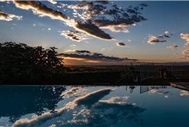 Eminent udsigt over solnedgangen, vinmarkerne og bjergene