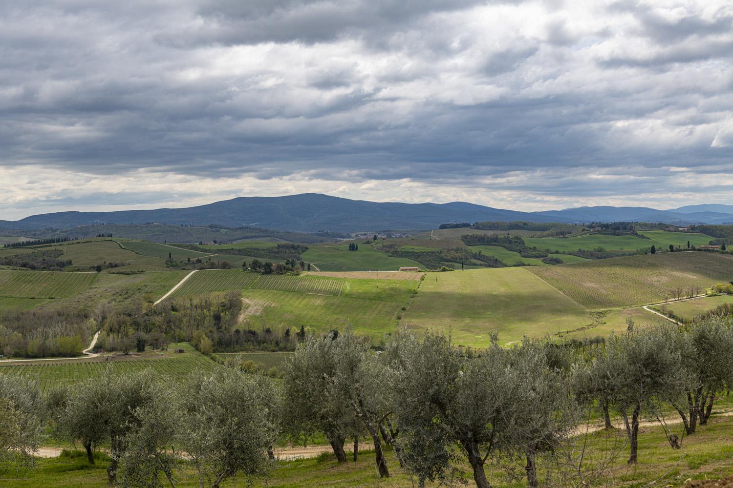 Det er en ganske ubeskrivelig køretur til Riserva di Fizzano. Man kører gennem meget kuperede vinmarker, og det hele står snorlige og smukt - og nye udsigter åbner sig ved hver lille bakketop. Selve Riserva di Fizzano ligger på en bakketop med stort set 360 graders udsigt. Wow - jeg synes, at jeg har fundet en perle.