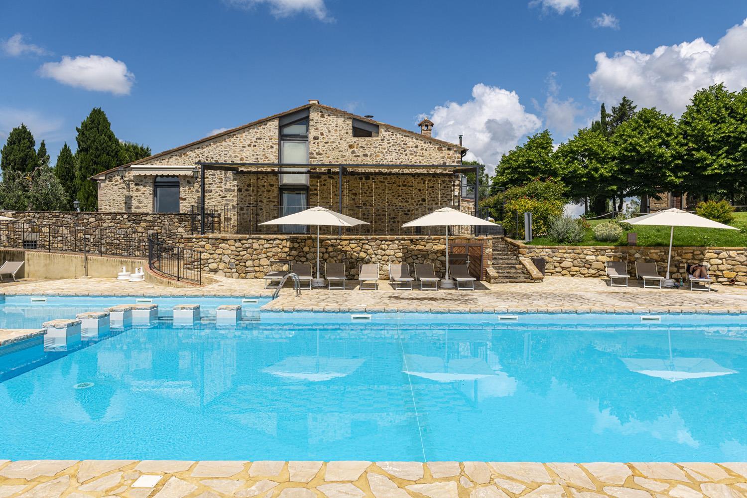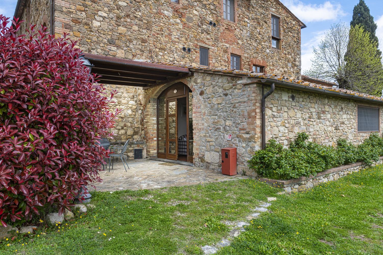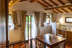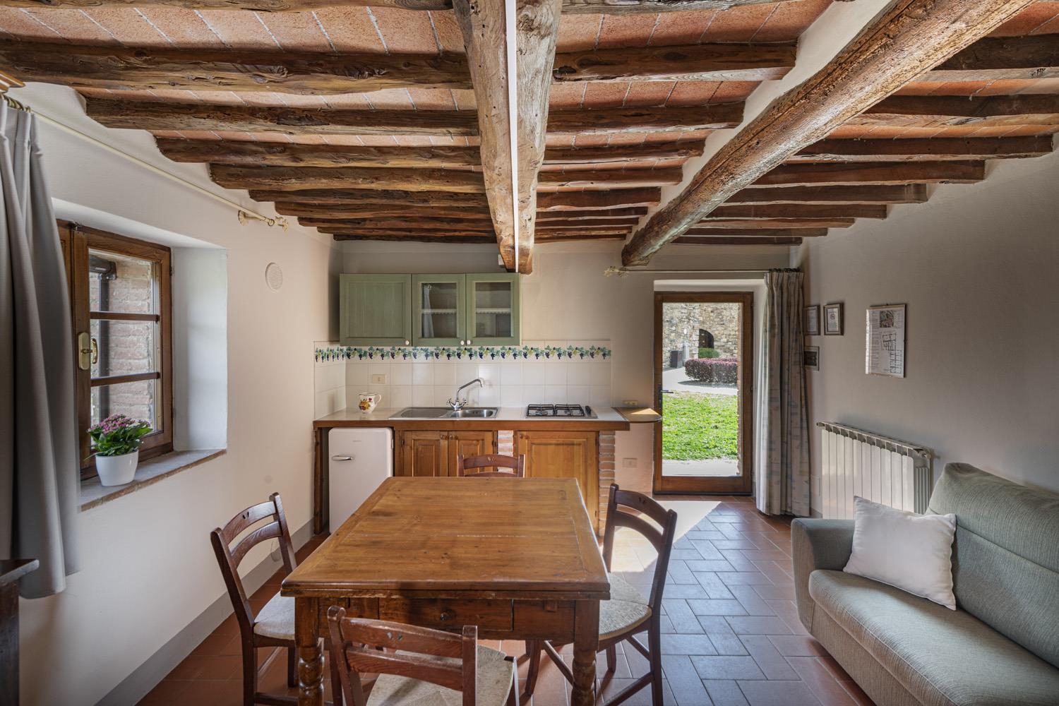 Landsbyen er blevet nænsomt restaureret og rummer i dag 19 smukt indrettede lejligheder, der kombinerer autentiske detaljer som terracottafliser, synlige træbjælker og åbne ildsteder med moderne bekvemmeligheder som aircondition og komfortable møbler. Hver lejlighed har sin egen unikke karakter, hvilket gør opholdet til en både historisk og komfortabel oplevelse. Der er også adgang til fælles udendørsområder med smuk udsigt over vinmarkerne. De fleste af lejlighederne har ikke privat terrasse, men her deler I fællesområderne med andre. Der er god plads til alle!