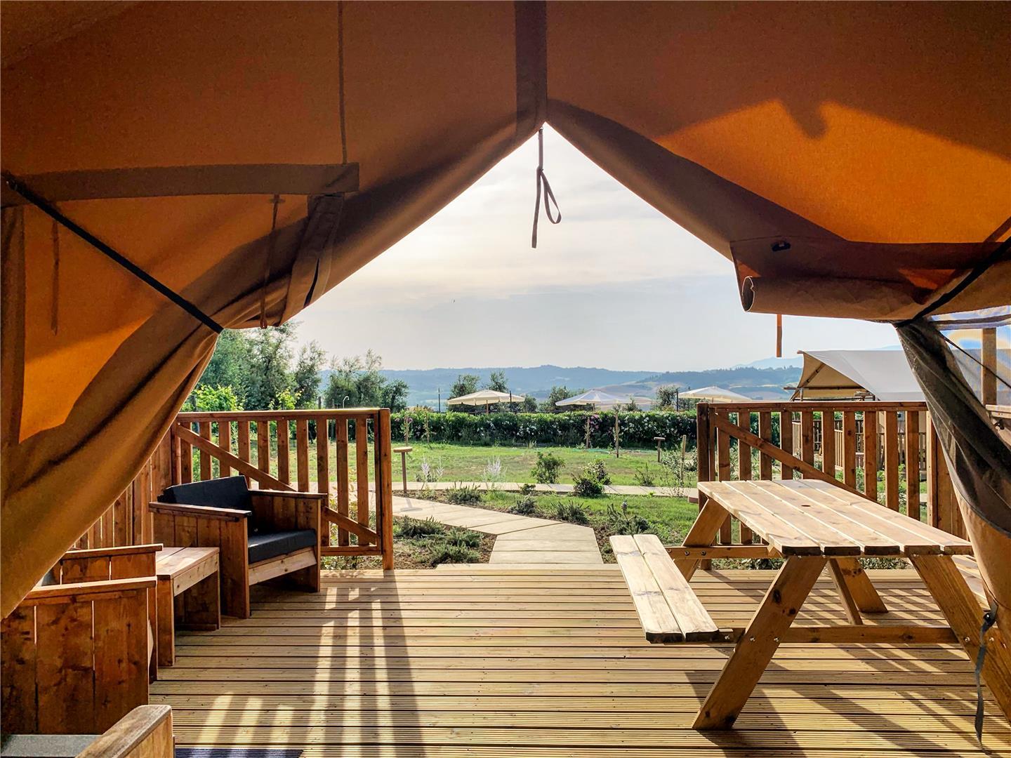 Tramonto er et glamping telt med plads til 5 personer, prisen er inkl. morgenmad, som leveres til teltet i en kurv. Glamping betyder at du skal have fornemmelsen af at campere, men uden at gå på kompromis med komfort og luksus (så som badeværelse og køkken.)