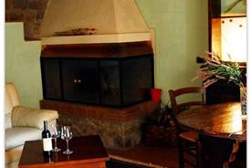 Studio i stueplan med pejs og stenvask. Badeværelse med brus. Udendørsområde med bord og stole. Køkkenhjørne, TV, minibar og vægmonteret hårtørrer.