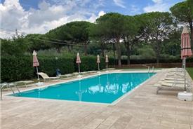 Lejligheden ligger i stueplan, ved siden af swimmingpoolen, og har et opholdsrum med stue, hvor der er en sovesofa og åben pejs, køkken, hall, et badeværelse med bruser samt soveværelse med en kingsize-seng, hvor der også kan tilføjes en tredje enkeltseng. Der er direkte udgang til en privat, møbleret have.