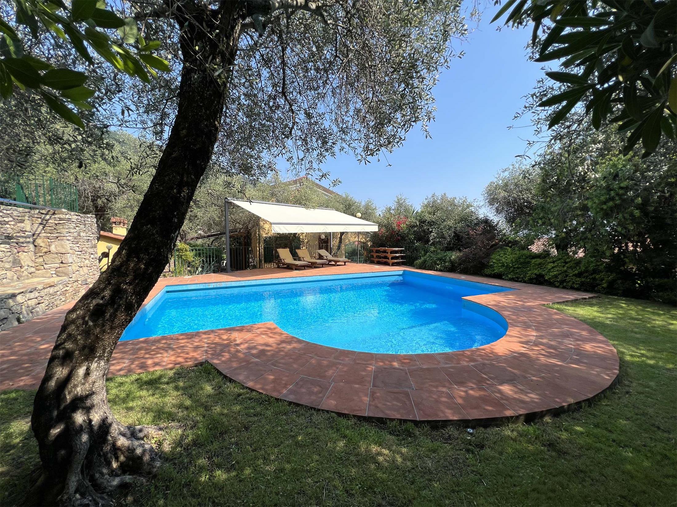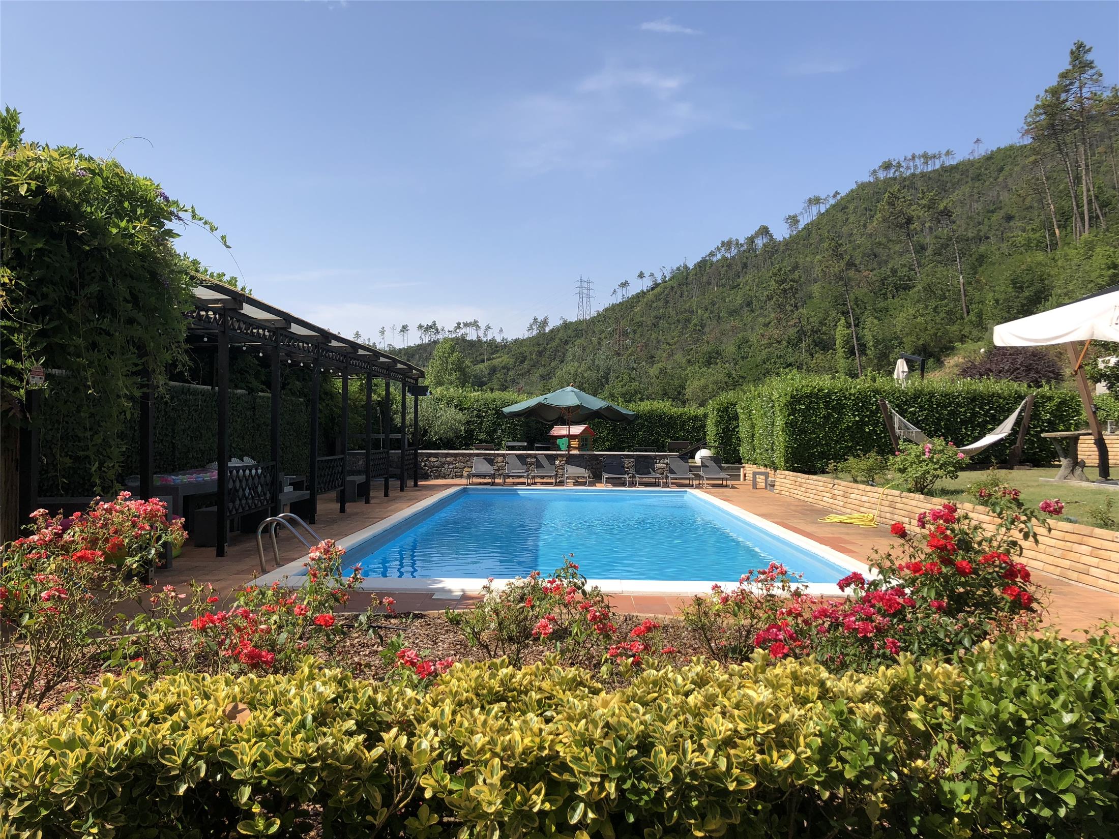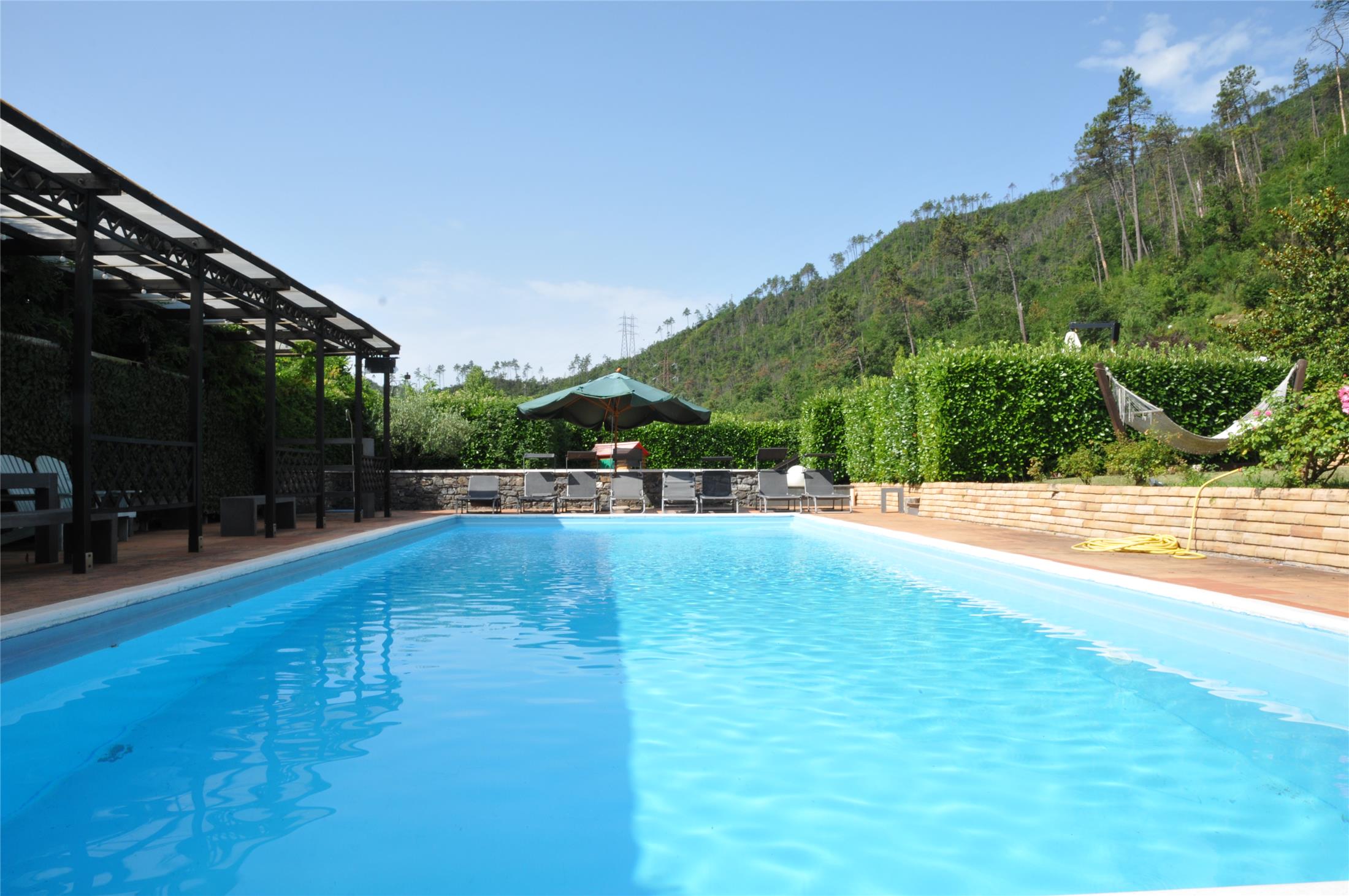 Mageløs villa i Lucca-provinsen. Her er der plads til 10 personer og 2 små børn (0-3 år, sovende i babysenge) med 5 dobbeltværelser, hver med tilhørende badeværelser. Villaen har en privat pool samt en overdækket terrasse, hvorfra der er en fantastisk udsigt over naturen og byen.