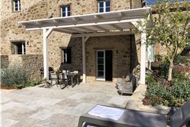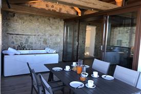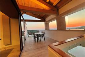 Canonica is a 115 m2 apartment that can accommodate 4 - 5 persons and is located on the 1st floor with a few steps up to the kitchen and another staircase up to the sleeping area. Outside, you have a lovely covered terrace with a view, dining area, sun loungers, and a jacuzzi.