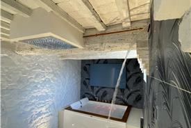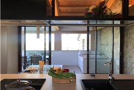 When you slide the glass door aside, you'll be greeted by a renovated apartment with a living area that includes a kitchen and dining space. To reach the living area with the sofas and TV, you need to descend 6 steps. This is also where the main entrance to the apartment is located. To the right of the entrance, there are 4 steps up to the sleeping area, where you'll find two double bedrooms with double beds and two bathrooms.