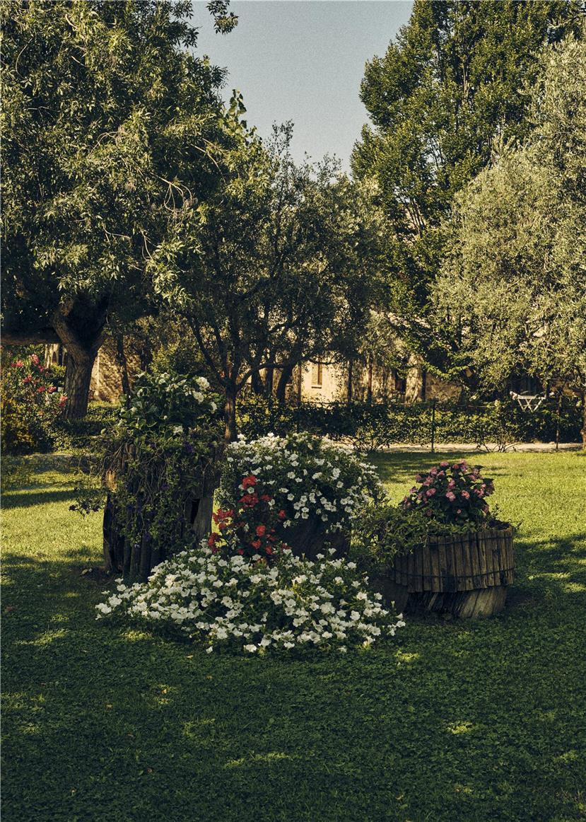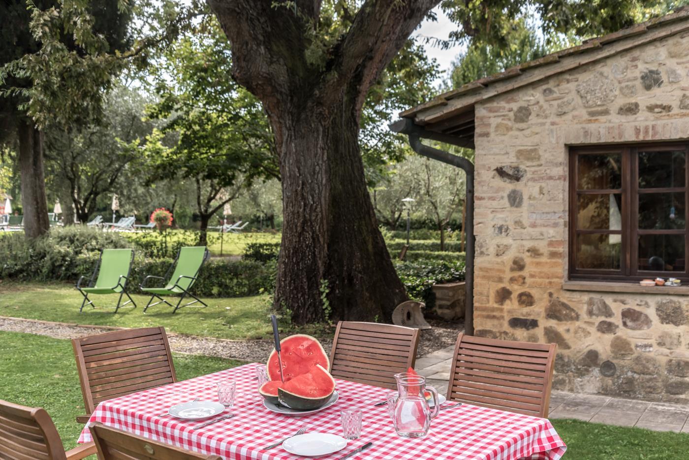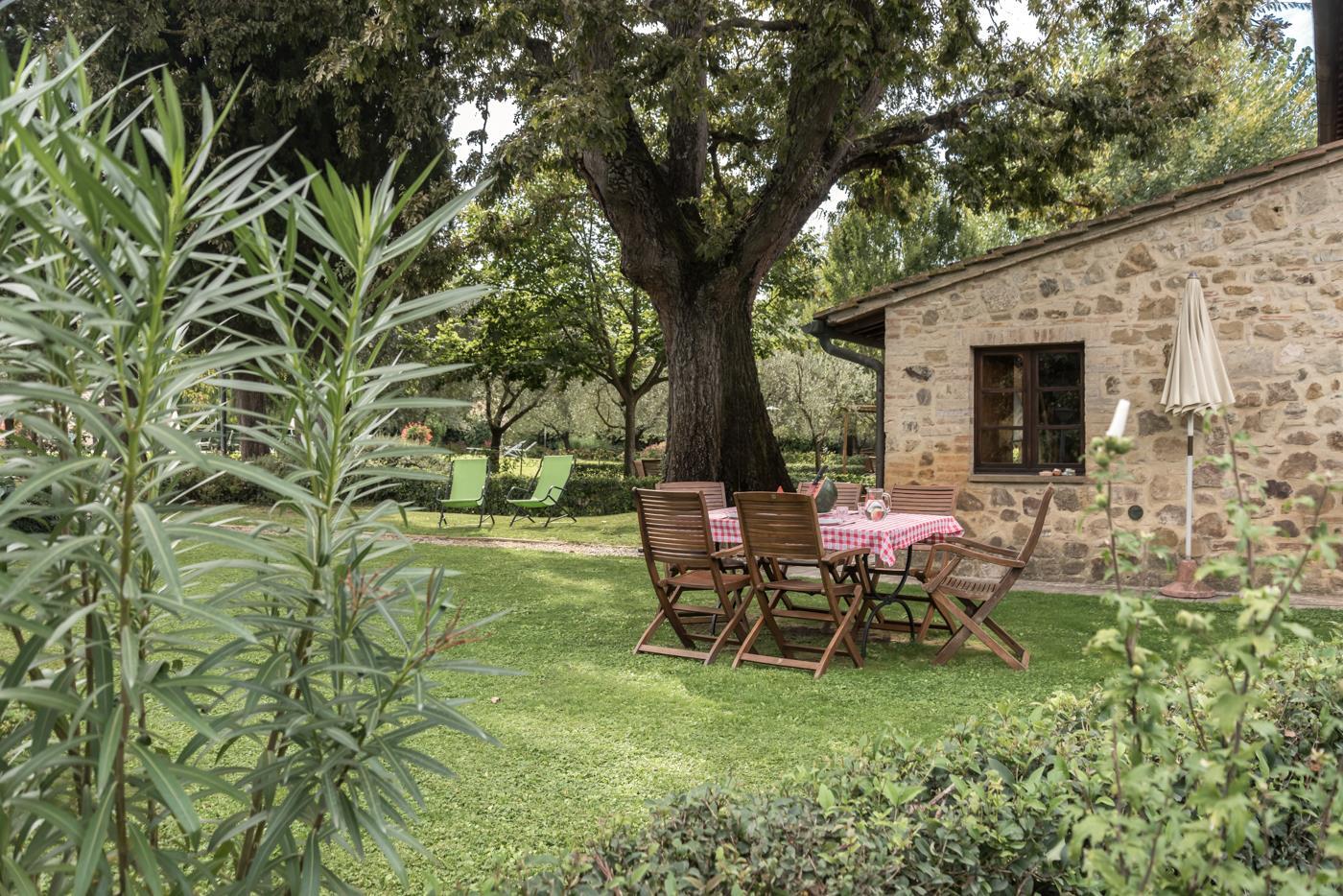You’ll first encounter the garden, which faces the pool area and is located near a more than 200-year-old Turkish oak tree. In the garden, you’ll find a drying rack as well as a table and chairs.