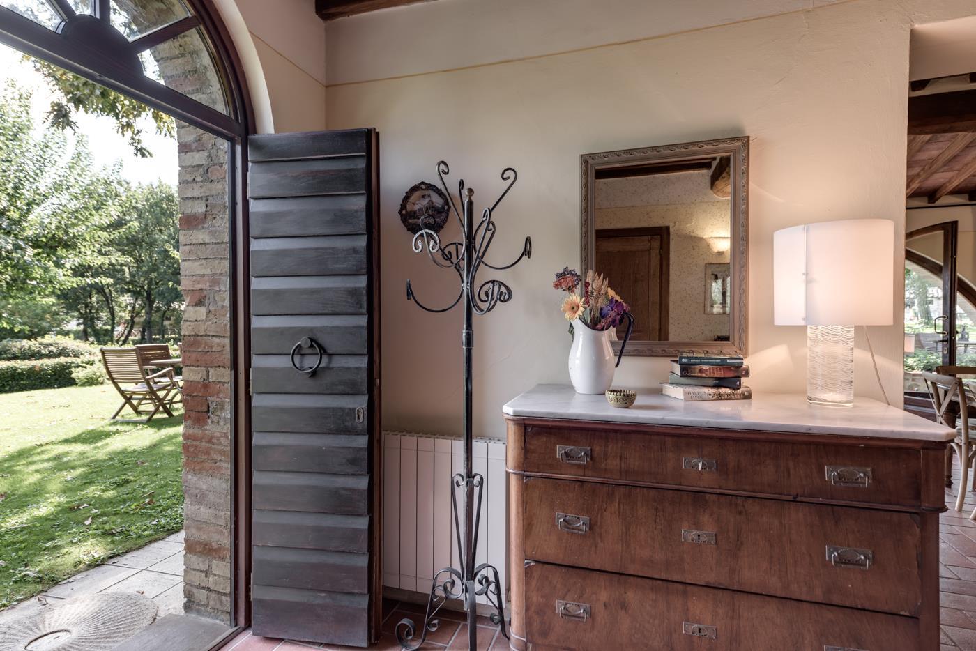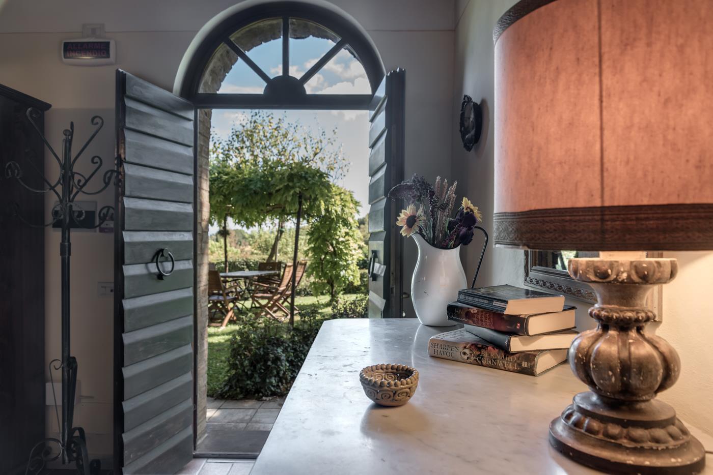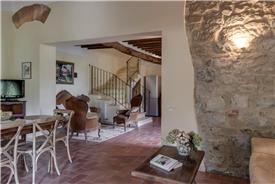 The apartment is 61 m², decorated in a classic Tuscan style, and is split across 2 levels, providing both a ground floor and a first-floor space. It has a slightly rustic look, as it was originally part of the old stable, now transformed into this cozy apartment.