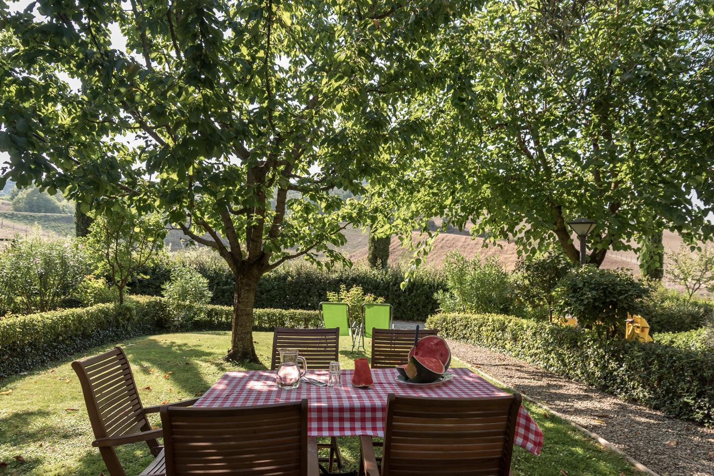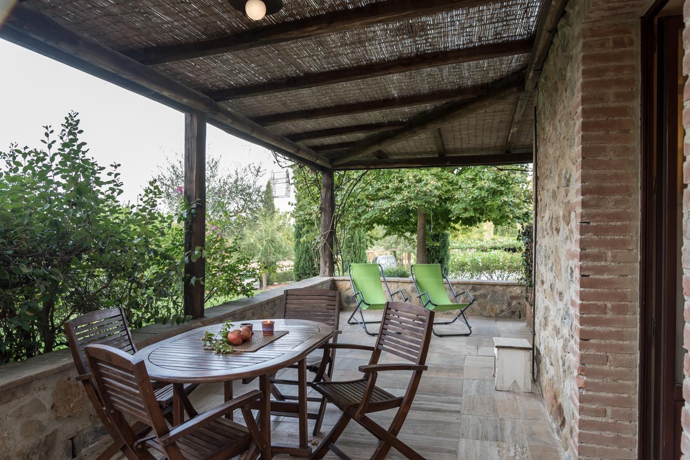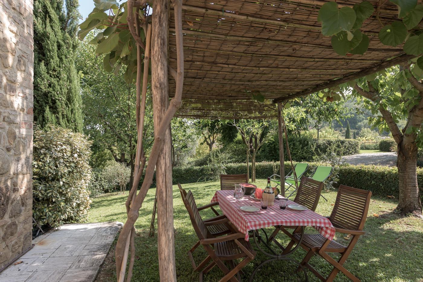 Outside the apartment, you have your own private garden, featuring a pergola with chairs and a table. There is also a clothesline for your laundry.
