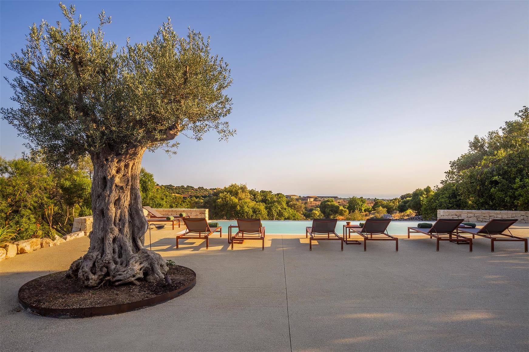 Even though the villa is stunning inside, you will not be disappointed by the breathtaking views that await you at Casa Ruah. In addition to the view, the property offers a lovely 2,000 m² garden with olive trees and panoramic scenery of the surrounding countryside. The villa also features a private pool (10 x 4 meters) surrounded by a sun terrace, loungers, and parasols – a perfect place to enjoy the sunshine or relax in the shade under the pergola. It is an ideal spot no matter if you visit in spring, summer, or autumn.