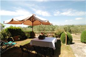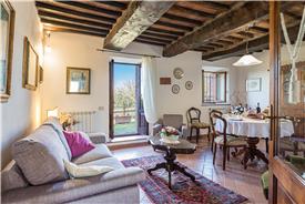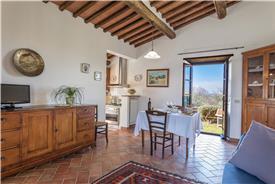 110 m2 - 3-værelses lejlighed i to plan til 4 personer med 2 dobbelte soveværelser, hvor der i det ene er et tilstødende værelse med 1 enkeltseng og 2 badeværelser. Udsigt til landskabet med oliventræer og vinstokke. Egen private terrasse mod vingården.