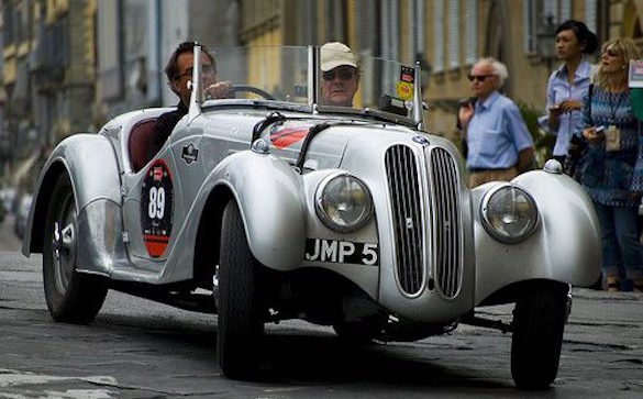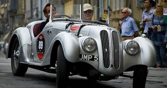 Mille Miglia. Billede af ældre italiensk sportsvogn i sølvfarve med to passagerer.