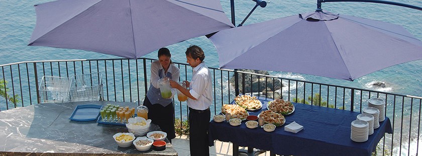 Billede fra Italiensk ferie. Billedet viser to tjenere, der står med italienske specialiteter.