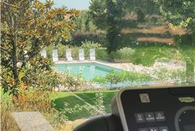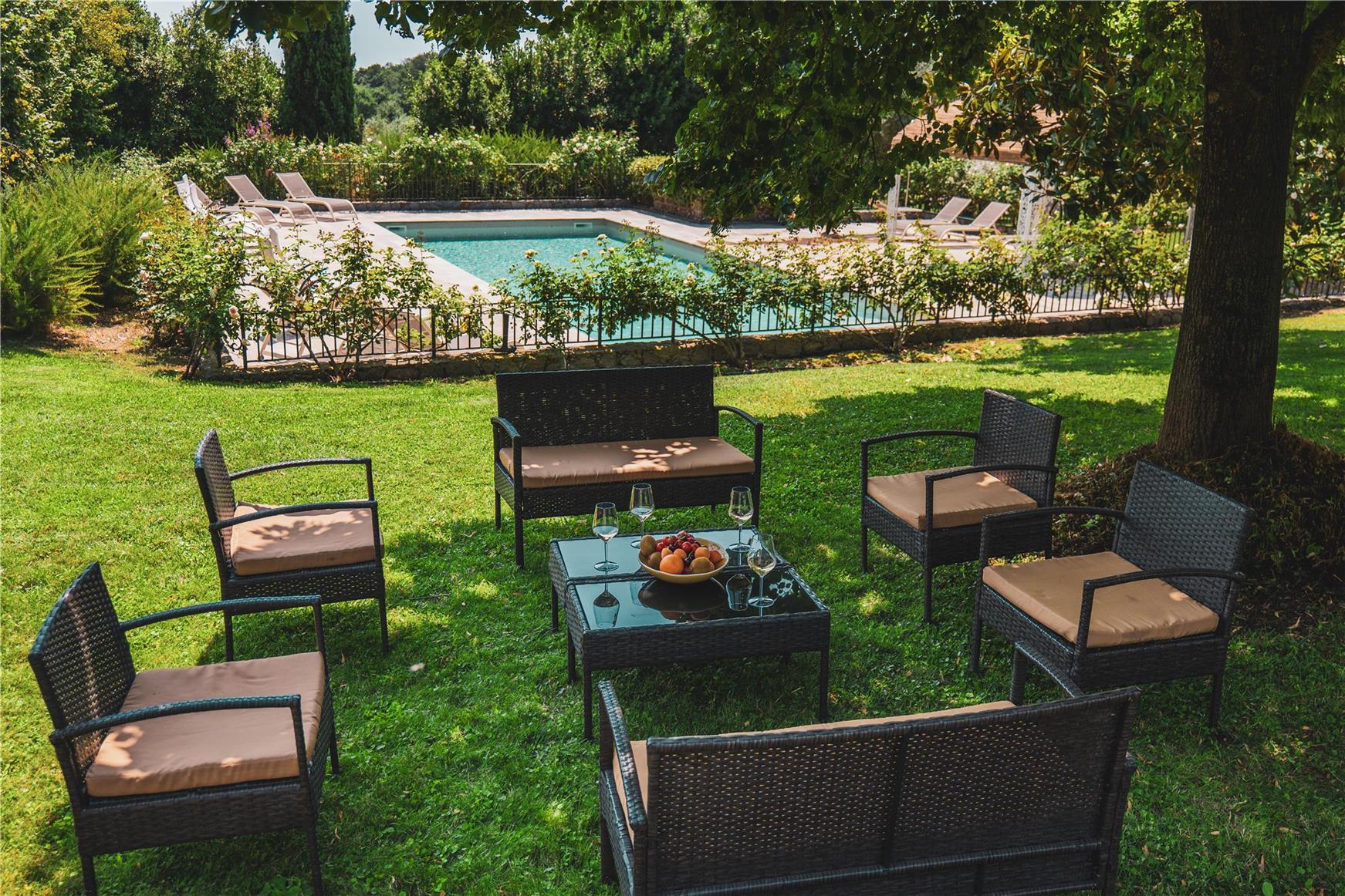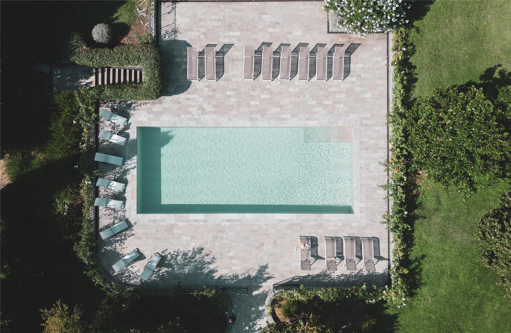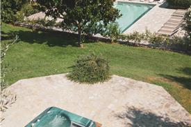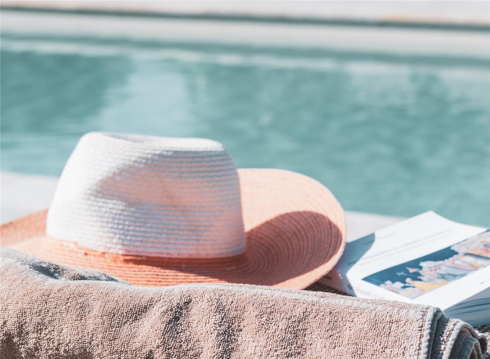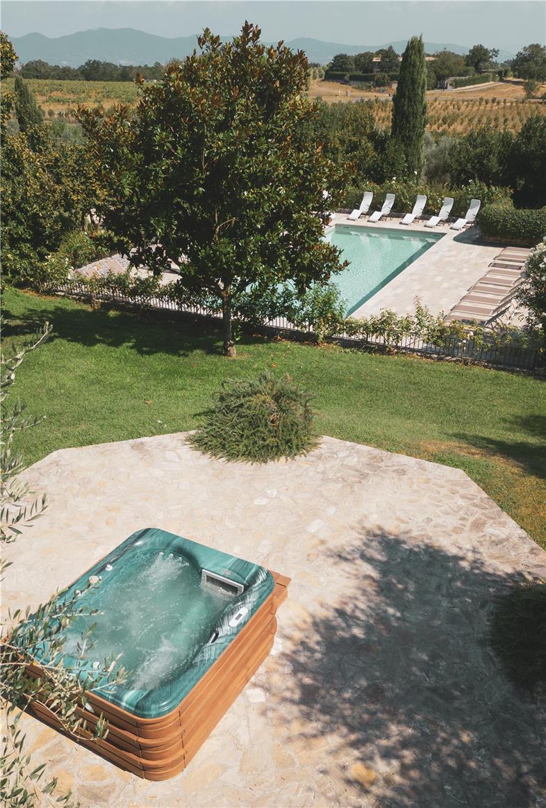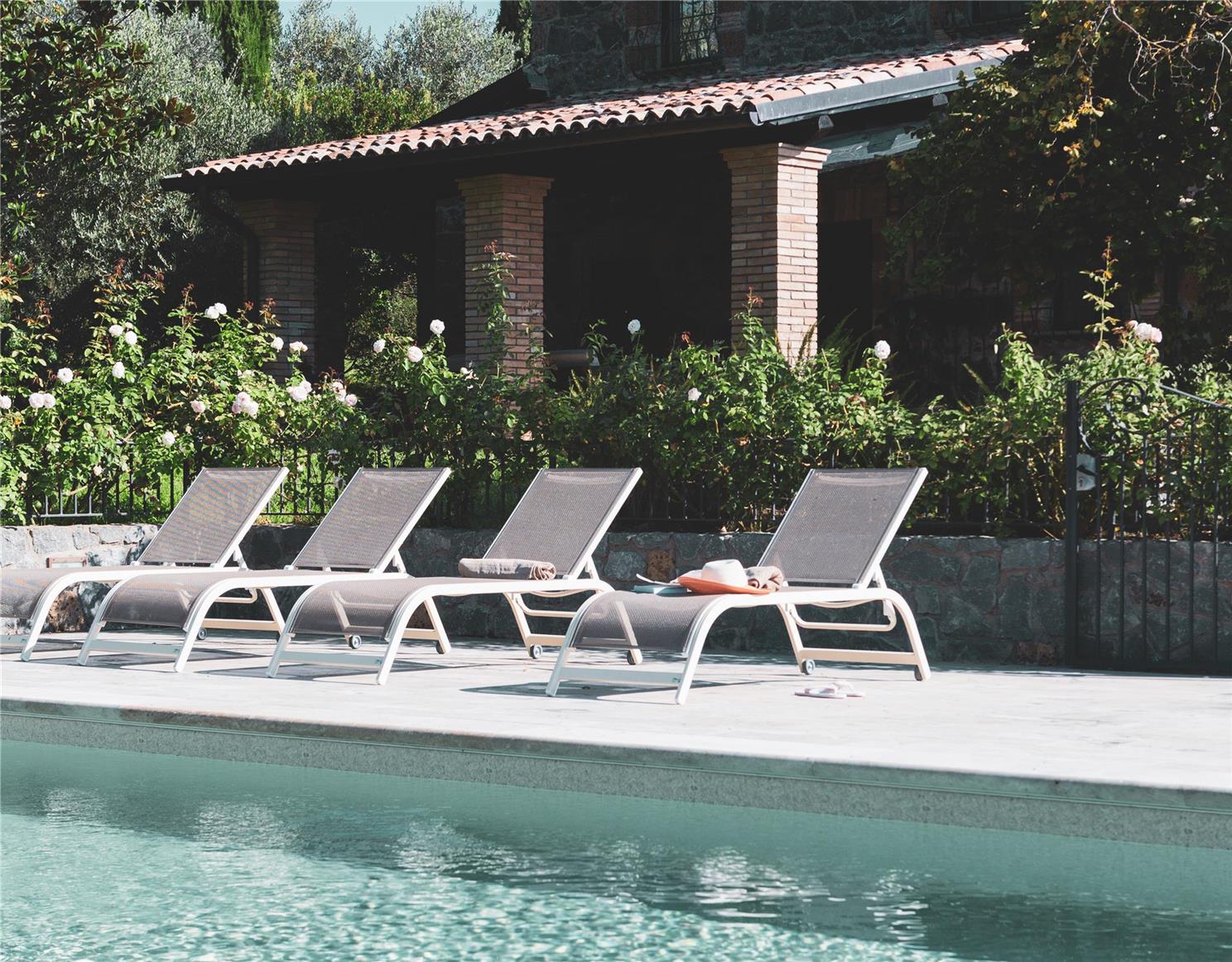 Poolen (15 x 6 meter / 1,3 – 2,5 meter dyb) er indhegnet og med liggestole til alle. Poolen har en god trappe ned, så rejser I med små børn eller vil de voksne ikke helt ned, jamen så kan man snildt sidde her på trappen og lege eller nyde omgivelserne. Selvom poolen er hegnet ind, så er det gjort smukt med roser, der kravler op og blomstrer om sommeren, og andre buske der er med til at skabe liv, hygge og atmosfære. Lige udenfor poolområdet har I også jacuzzien stående, som I kan sætte jer op i og koble helt af.